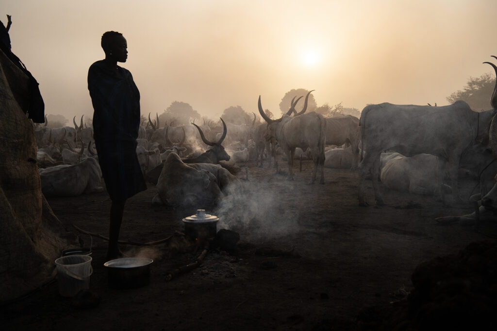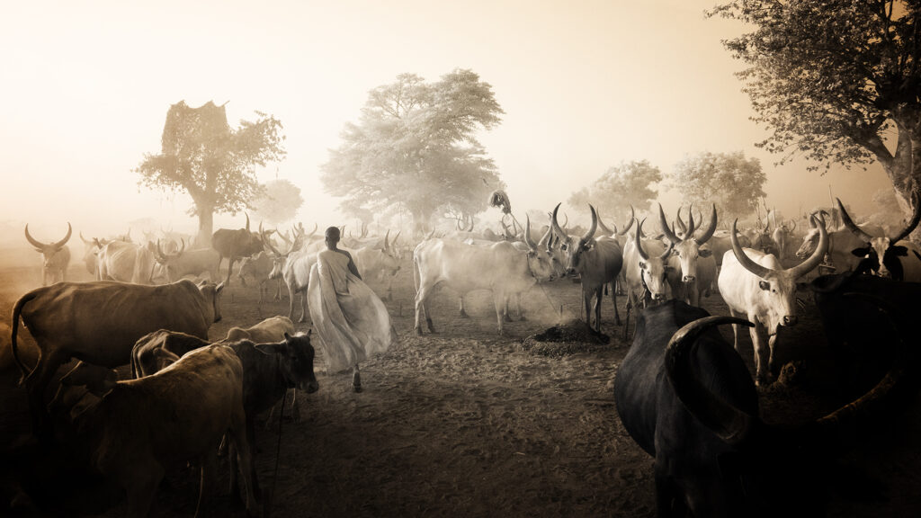 Legendary in the rawness of South Sudan is the smokey cattle camps of the Mundari, a world filled with subdued voices of beasts and ghostly silhouettes roaming throughout. Life in the camp starts well before sunrise as the children begin by gathering the fresh dung deposited overnight. This will become the fuel to light fires just before the cattle return in the evening. As the sun dips below the horizon, the community gathers around crackling fires, their laughter and voices carrying the weight of ancestral stories. Through the flickering glow, they pass down ancient wisdom,, perpetuating a cultural legacy that binds them together like a sacred rope.