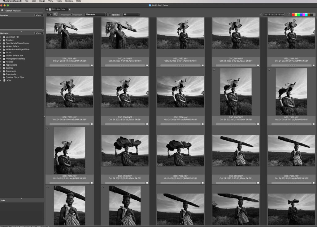 The real magic is that I see it in black and white, but the raw file is in color. I use photo mechanics for instant and fast culling as part of my workflow. This program allows me to see the images in black and white, just as I saw when I captured the image, but when I double-click and open it in Photoshop, it is the color image in raw where my post-processing begins.