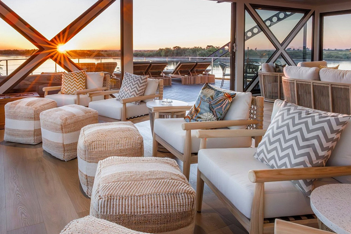 After our early morning on the river and breakfast, we will be transferred to our exclusive luxury houseboat on the Chobe River. Our houseboat is spread over three levels with multiple decks. The lounge and dining area, located on the middle deck, can be opened on three sides, with stunning panoramic views. The upper level hosts a viewing deck equipped with a table, chairs, and sun loungers, perfect for relaxing as we drift between our private mooring points. The lower deck features five en-suite cabins, each furnished with solid African rosewood.